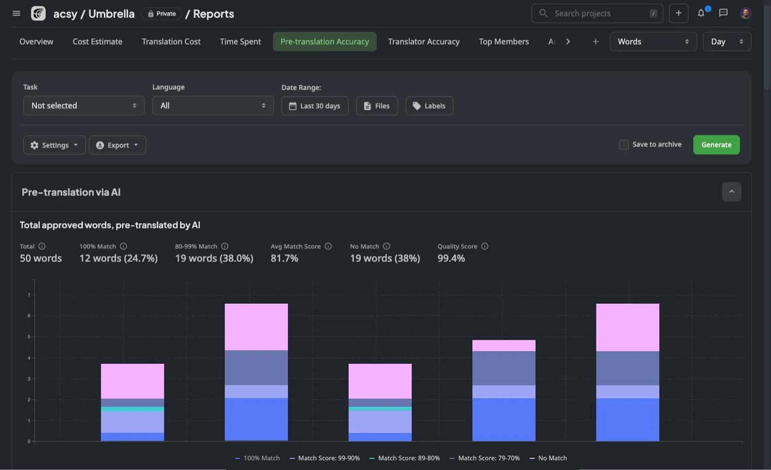 Stop guessing your localization timeline and budget. Get real-time visibility into translation progress, costs, and quality with Crowdin's advanced analytics suite.